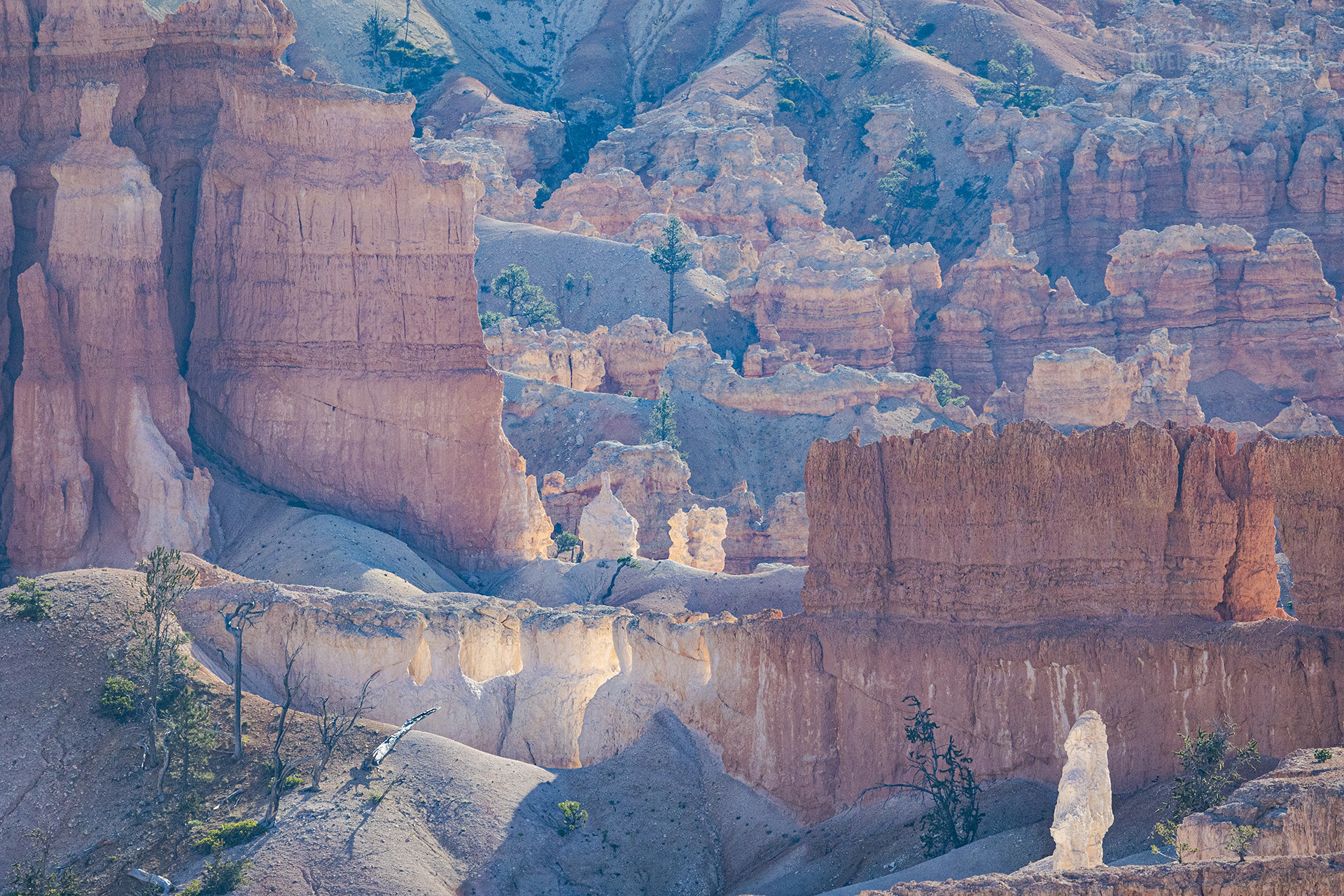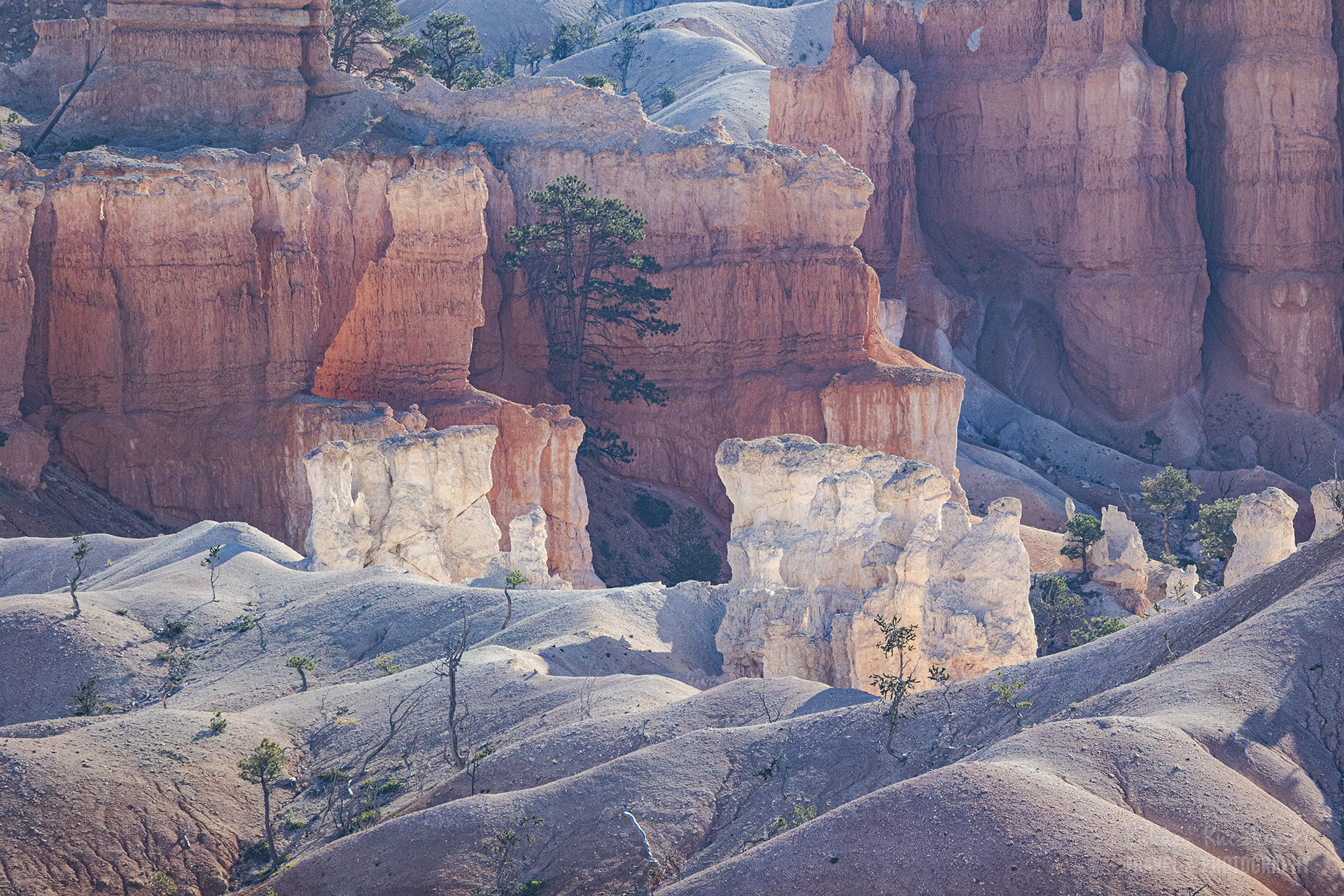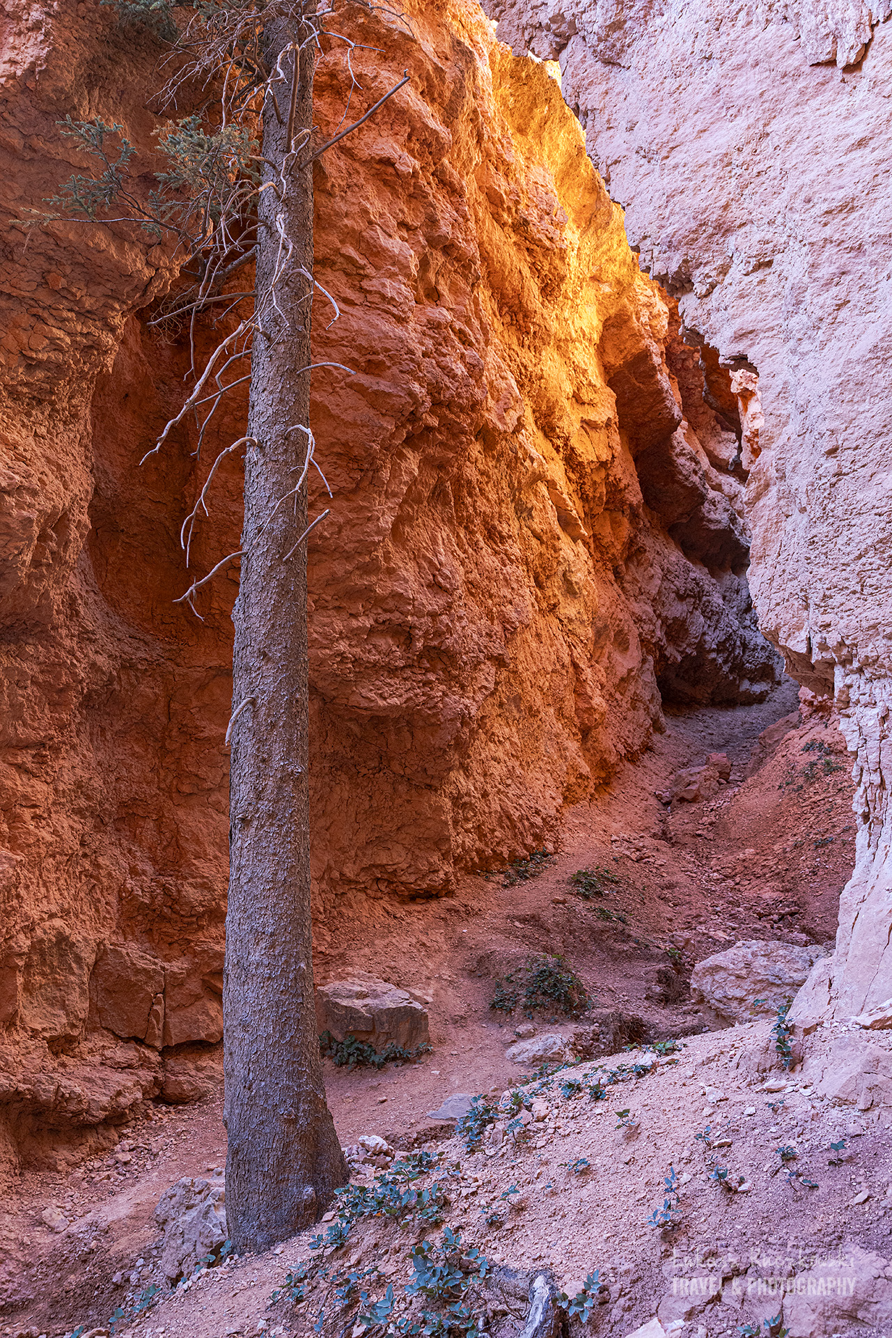 Jest lekko zimno, co akurat cieszy, bo człowiek z tym fotograficznym plecakiem na plecach szybko zaczyna się wewnętrznie gotować, szczególnie na podejściach. A tych jest całkiem sporo, gdyż ścieżka co rusz idzie to w górę, to w dół. Ale ogólnie, po osiągnięciu dna amfiteatru, powoli pniemy się do góry. Nasz cel to Sunrise Point, skąd, wbrew nazwie, najlepiej oglądać zachody Słońca. Po drodze mijamy parę nowożeńców i ich fotografów. Zdjęcia mogą wyjść magiczne w tym miejscu.