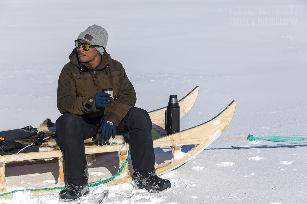 Po godzinie jesteśmy już na saniach. Śnieg czasami jest twardy, czasami miękki i znowu trzeba wykopywać sanie. Ogólnie powinno być o wiele zimniej, ale ocieplenie klimatu robi swoje. Za kilka lat takie podróże będą niemożliwe. Dosyć szybko pokonujemy odległości. Czasami trzeba zejść z sań i długim kijem sprawdzić lód. Pod warstwą śniegu kryją się bowiem różne niespodzianki. Oczywiście nie wiem kiedy należy to robić – tutaj zdaję się na Inuitów znających śnieg i lód bardzo dobrze.