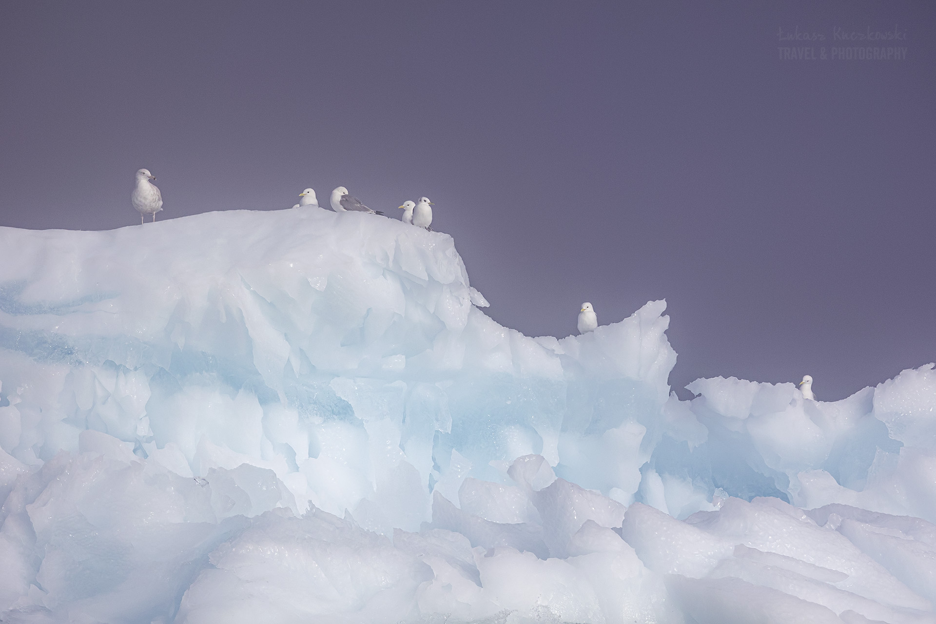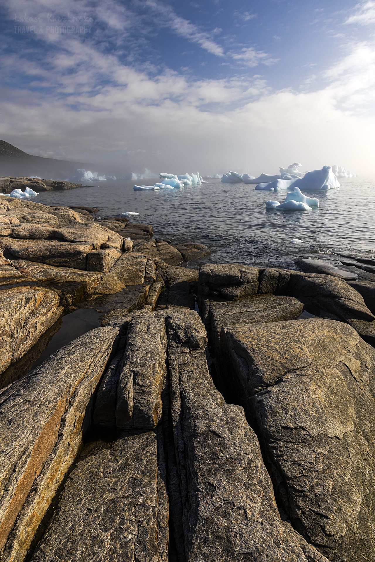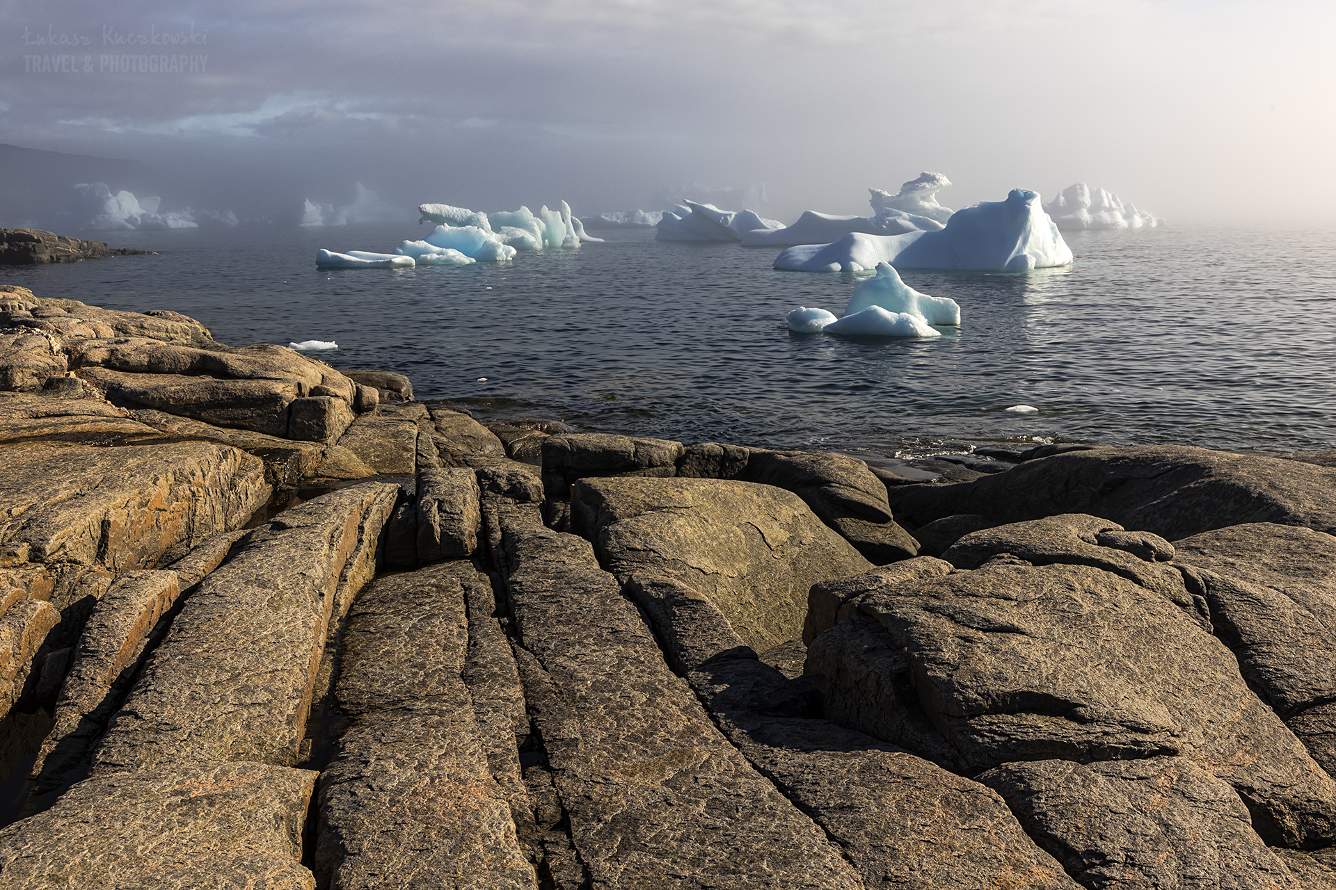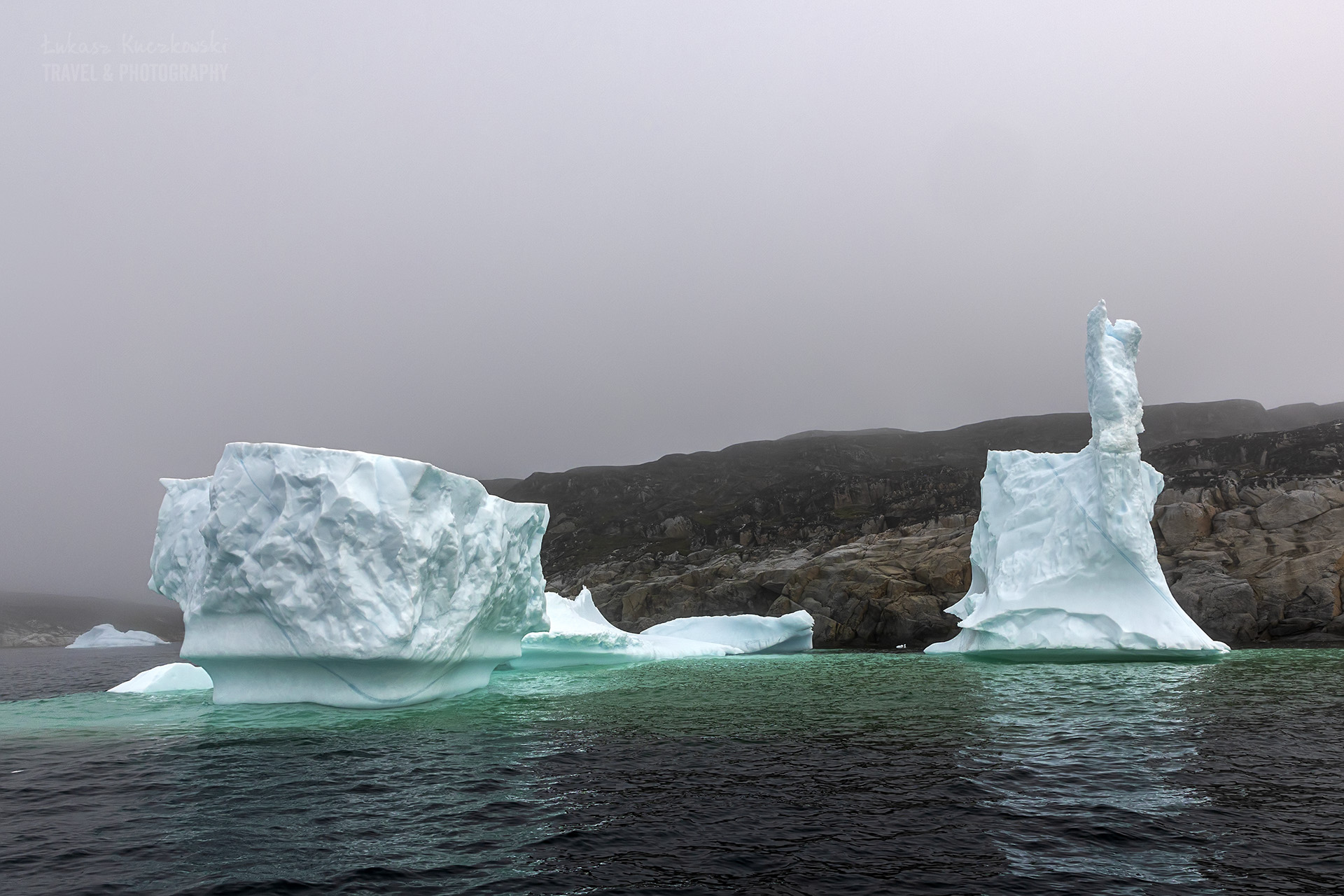 Wybraliśmy oczywiście łódź. Tym bardziej, że całe wybrzeże było pokryte gęstą mgle. Podróż przez tą mgłę z dużą szybkością był surrealistycznym przeżyciem. Co chwilę z mgły wyłaniały się większe i mniejsze e góry lodowe, niektóre bardzo blisko nas. Ale to nie zachęcało skippera do wolniejszej jazdy. pruliśmy przez spokojne morze niczym torpeda. Przy tej prędkości i warunkach (wiatr i ciągle zmieniający się krajobraz) trudno było fotografować. Ale do cierpliwych świat należy.