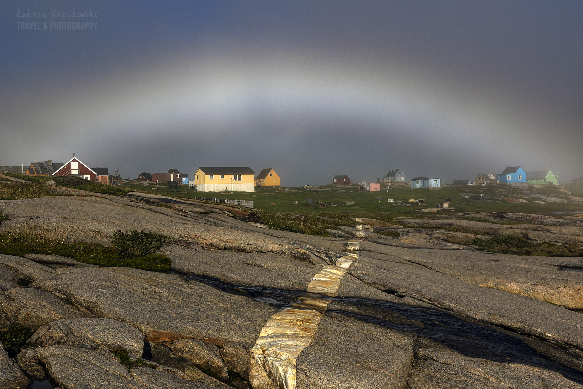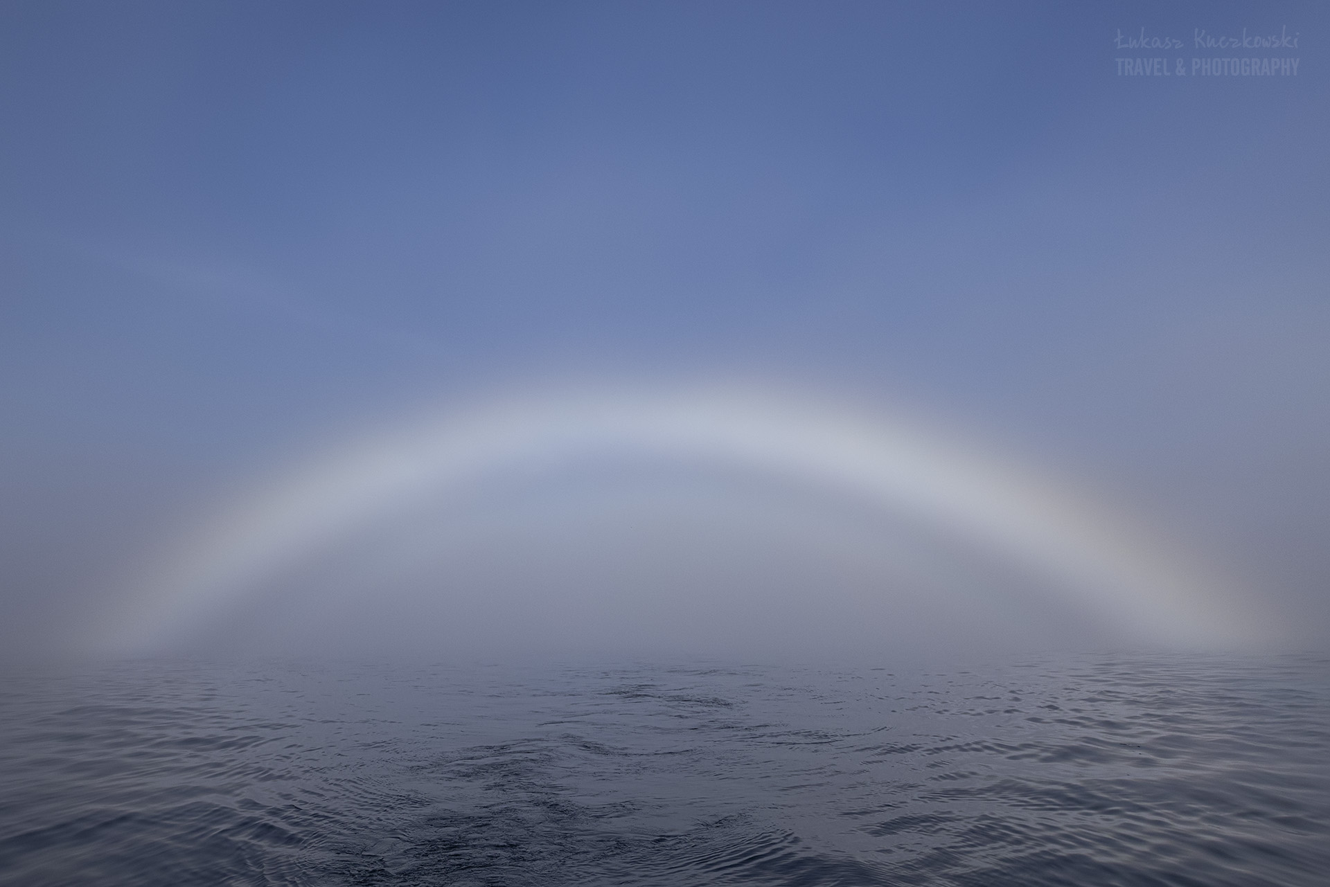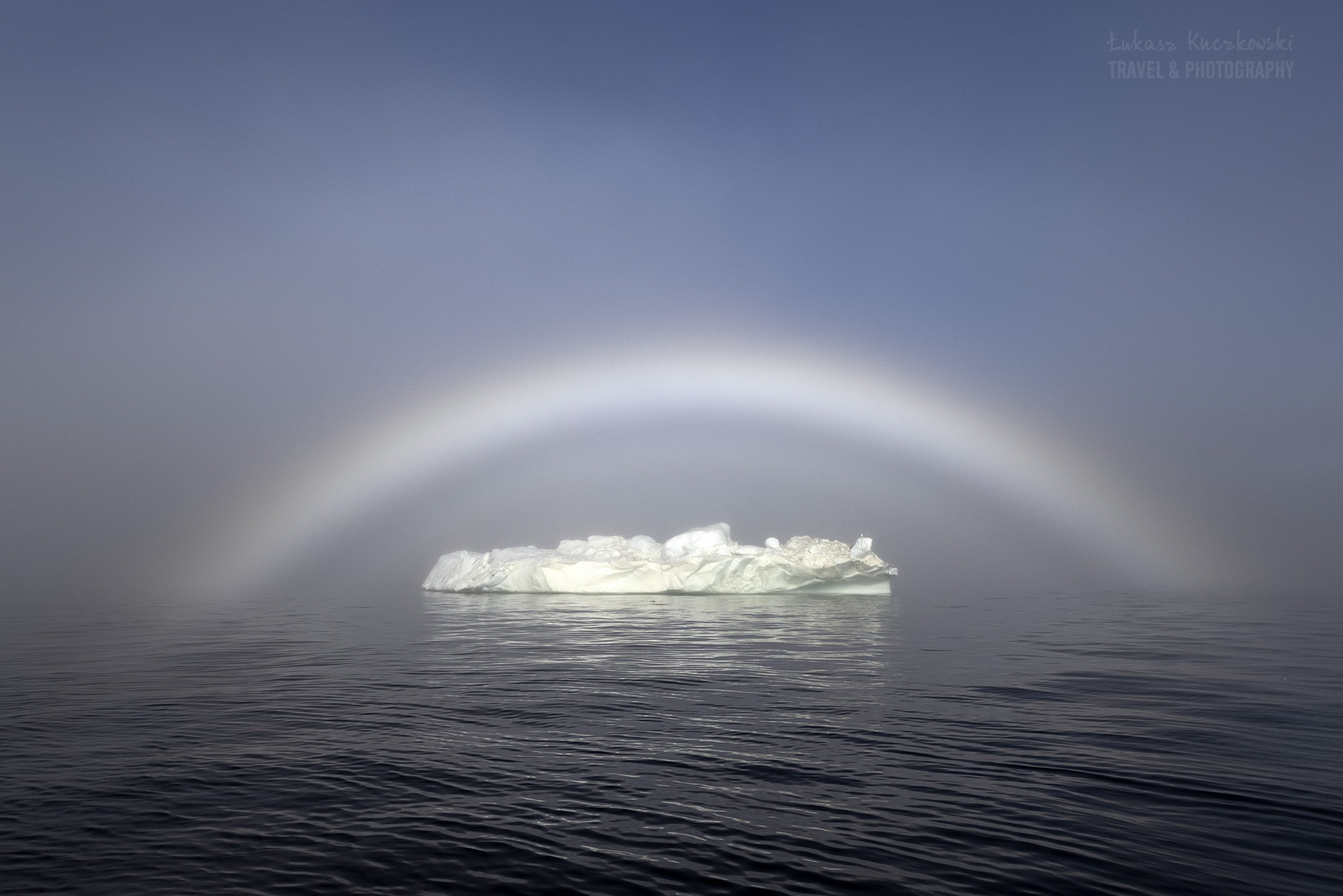 fotografowałem sobie w najlepsze, aż przyszła biała tęcza (fog bow). A raczej mglista tęcza. Powstaje oczywiście podczas mgły, kiedy promienie słoneczne załamują się, a następnie odbijają od kropelek wody obecnych we mgle. I mamy białą tęczę. Towarzyszyła nam aż do Ilulissat w drodze powrotnej.