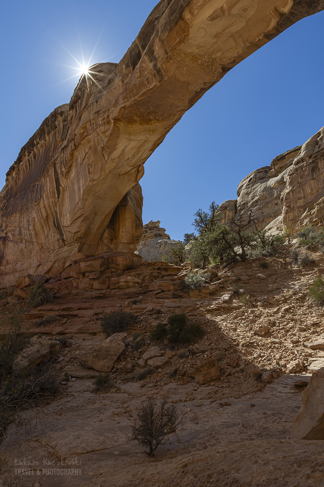 Do Hickman Bridge prowadzi niezbyt trudny szlak liczący niecałe 3 kilometry. Początkowo ostro pod górę, ale później idzie się łagodnie i po około 1h dochodzimy do mostu. Wyzwaniem jest nie sama droga, ale upiorne Słońce i brak chmur. Warto zabrać nakrycie głowy i dużo wody. Most daje upragniony cień, którego oczywiście nie ma na szlaku. No i jest naprawdę wielki. Szczególnie, gdy siedzimy pod nim i dumamy o tym, że przecież może w każdym momencie spaść nam na głowę.