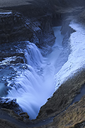 Wstajemy. Oczywiście nadal otacza nas czarna noc. Szybko składamy namiot (mamy coraz większą wprawę), pakujemy się i ruszamy pod wodospad Gullfoss. Nad nami ciągle czyste niebo. Nadal widać gwiazdy. Zorza zniknęła – w duszy dziękuję jej za niesamowite, nocne przeżycia. Droga jest śliska. Idzie się po deskach, które w nocy pokrył szron. Po kilku minutach docieramy do pierwszego punktu, z którego widać wodospad. Jeszcze wcześniej słychać potężny huk. To zapowiedź tego, co nas czeka na miejscu. Nie byłem jednak przygotowany na to co zobaczę. Olbrzymi kanion wił się aż po nieodległy horyzont. Do kanionu wpadała olbrzymia masa wody spływająca kaskadami przez jakieś dwieście metrów. Wszystko to we wszechobecnej parze. Ściany kanionu były pokryte lodem. Trudno to w ogóle opisać.