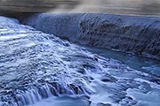 Jak zwykle się rozdzielamy i każdy z nas żyje własnym fotograficznym życiem. Do wschodu jeszcze trochę czasu. Wymyślam sobie kadr i mam nadzieję, że słońce zadziała. Wszystko wokół jest oszronione. Stoimy często poza barierkami – trzeba bardzo uważać bo jest bardzo stromo. Jak się poleci w dół, to jest duża szansa na spotkanie z wodospadem „twarzą w twarz”. Nietrudno przewidzieć rezultat tego spotkania. Myślę, że z tej kipieli na dole nikt nie wyszedłby z życiem.