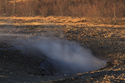 Dopadamy gejzeru. Nim się rozstawiliśmy znowu poleciał w górę. Nie wiem ile to było metrów, ale poleciał naprawdę wysoko. Coś czuję, że będą kłopoty ze złapaniem go w kadr. Ale co tam – popróbujemy. Wszędzie wokół śmierdzi siarką i płyną leniwe strumyczki parzącej wody. Trzeba uważać. Jajka spokojnie można gotować na tej wodzie.