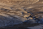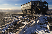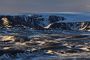 Ruszamy. Początkowo po asfalcie, ale później już po szutrze. Trzeba uważać, bo koleiny i duże kamienie czają się wszędzie. Wokół nas rozpościera się iście marsjański krajobraz. Z tą tylko różnicą, że dużo tutaj śniegu. Widoki za to przepiękne. Wzrok sięga naprawdę daleko. Widać odległą rzekę wypływającą z wodospadu jak wije się w drodze do wybrzeża. Tam daleko jest nadal zielono. Tutaj już biało. Wiatr zamknął śnieg i lód w przedziwnych formach.