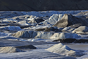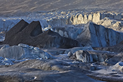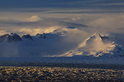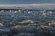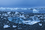Po chwili przychodzi jednak ochota na inne kadry. Zapuszczam się zatem wzdłuż laguny po stromym zboczu. W lagunie jest mnóstwo gór lodowych. Całkiem sporych. Na wprost błyszczy czoło lodowca, po lewej i prawej dominują wysokie szczyty. Musi tam być niezła zadymka – widać ciągle pióropusze zwiewanego śniegu. Sama laguna mocno zamarznięta. Pewnie by się dało przejść do czoła lodowca po tym lodzie. Droga przypomina mi analogiczne trasy jakie pokonywałem na Grenlandii czy w Patagonii. Łza się kręci w oku ze wspomnień. No i z samego wiatru.