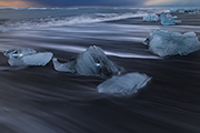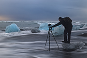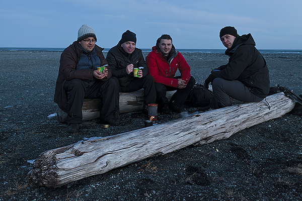 Wreszcie docieramy do laguny. Statywy rozkładamy w biegu. Słońce ostatkiem promieni muska co wyższe góry lodowe. Jesteśmy trochę za późno. Ale zobaczyliśmy inne miejsca. Jeszcze w szale rzucamy się na plaże. Ale i tutaj kadry już nie te. Zapada zatem decyzja o odwrocie. Czas na śniadanie – nie jedliśmy cały dzień. Rozbijamy zatem prowizoryczną jadłodajnie na długiej belce wyrzuconej przez morze na plaże i zajadamy ze smakiem. Przed nami jeszcze jedno wyzwanie tego pełnego wrażeń wieczoru – wodospad Skógafoss.