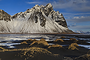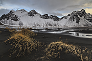 Po godzinie docieramy do naszego celu podróży. Przed nami ośnieżone szczyty. Ale to co nas kręci to ich odbicie w odzie i wszechobecne czarne wydmy porośnięte żółtymi trawami. Światło nie do końca współpracuje, ale nadal jest bardzo miękkie. Jak zwykle wpadamy w szał poszukiwania kadrów. Nikt już nie myśli o nie zjedzonym ciągle śniadaniu. Wydmy są intrygujący, ale jeszcze bardziej – odbicia gór w wodzie. A gdy można to wszystko połączyć to jest dosłownie dziki szał. Chodzę tu i tam. Ciągle szukam tego wymarzonego kadru. Jakby tego było mało, po chwili defiluje przed nami islandzki kuc z jeźdźcem :-).