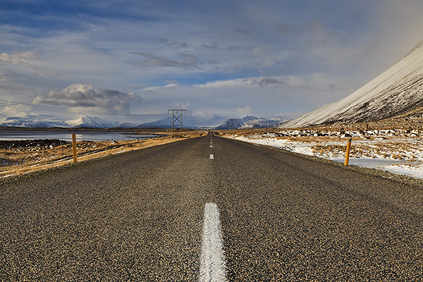Kiedy już się nasyciliśmy pierwszymi kadrami przyszedł czas na zastanowienie się. Czasu wcale nie mamy dużo. A chcemy przecież na zachód wrócić nad lagunę. Z żalem, ale wsiadamy do samochodu i wracamy w kierunku laguny. W międzyczasie chmury się trochę rozstąpiły i wyszło słońce. Od razu wszystko nabrało kolorytu. A mnie zaczęły fascynować … islandzkie drogi. Fascynacja jest tak silna, że … zatrzymujemy się na asfalcie i robię zdjęcia. A co. Koledzy żartują, że zapewne wydam album z islandzkimi drogami. Czemu nie. W takim krajobrazie byłyby to niezwykłe drogi :-).