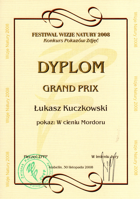 Spieszno mi donieść, że na festiwalu Wizje Natury 2008 zdobyłem Gran Prix festiwalu za diaporamę z Nowej Zelandii zatytułowaną „W CIENIU Mordoru”. Słów mi nadal brakuje :-).