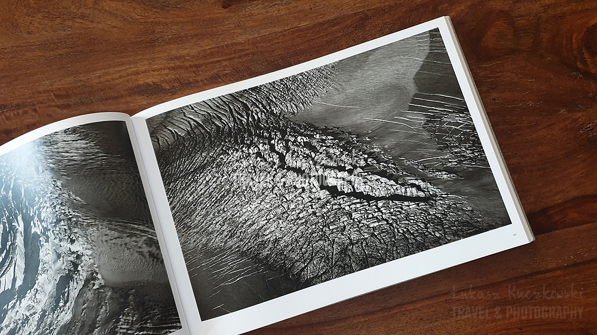 Album zawiera ok 200 zdjęć islandzkich lodowców wykonanych z góry, z lotu ptaka. Wszystko utrzymane w tonaji czarno – białej. Zdjęcia są w formacie a4 i nie znajdziecie w albumie żadnych udziwnień typu zdjęcie na 1/8 strony, czy łamanie zdjęć na dwie strony. To nie wątpliwie duży plus tego albumu. Przez to zdjęcia ogląda się bardzo przyjemnie. Wszystko spina grupa płucienna okładka z dodatkową przyklejoną obwolutą.