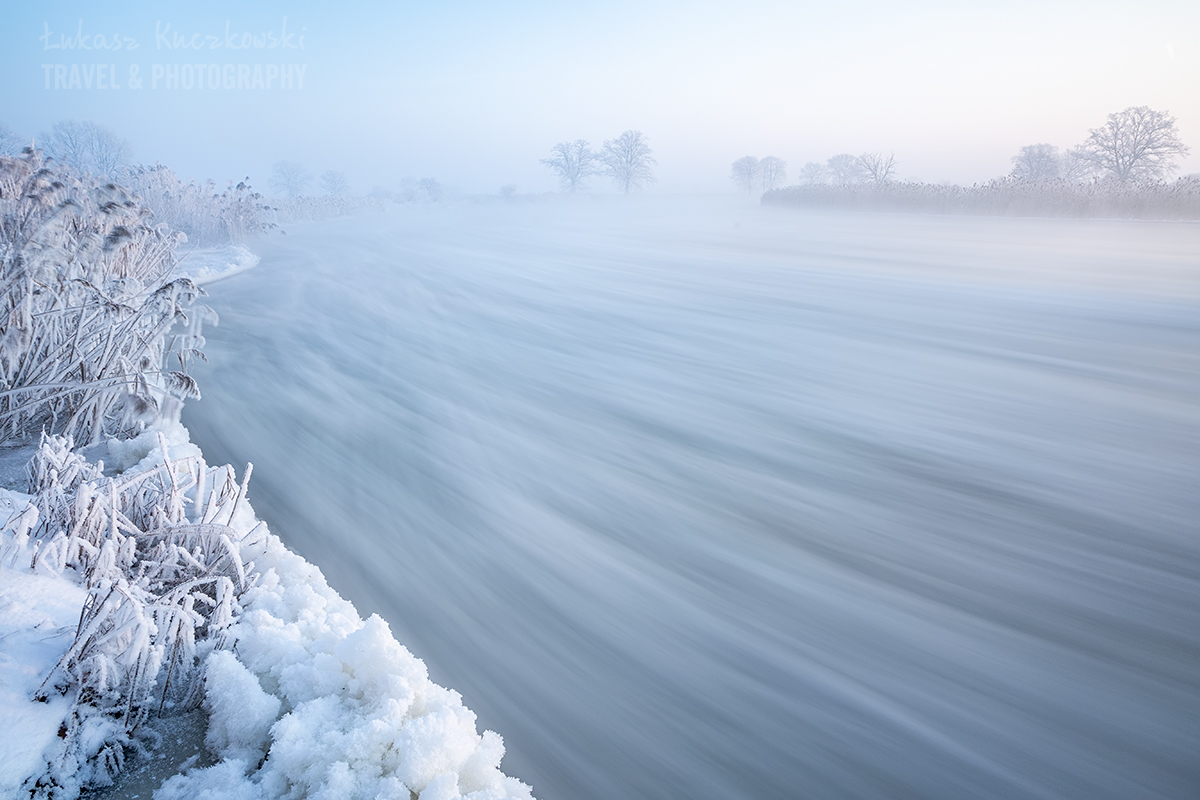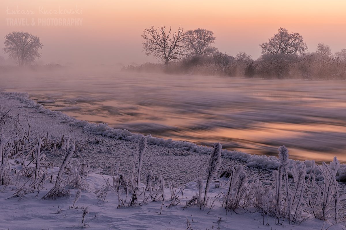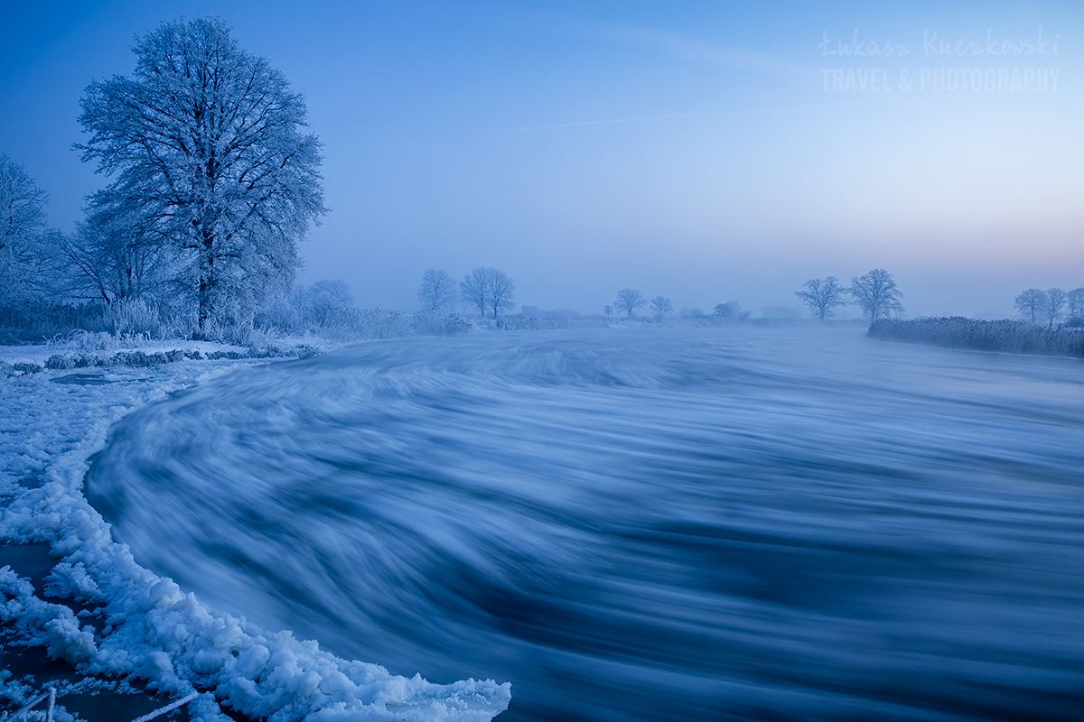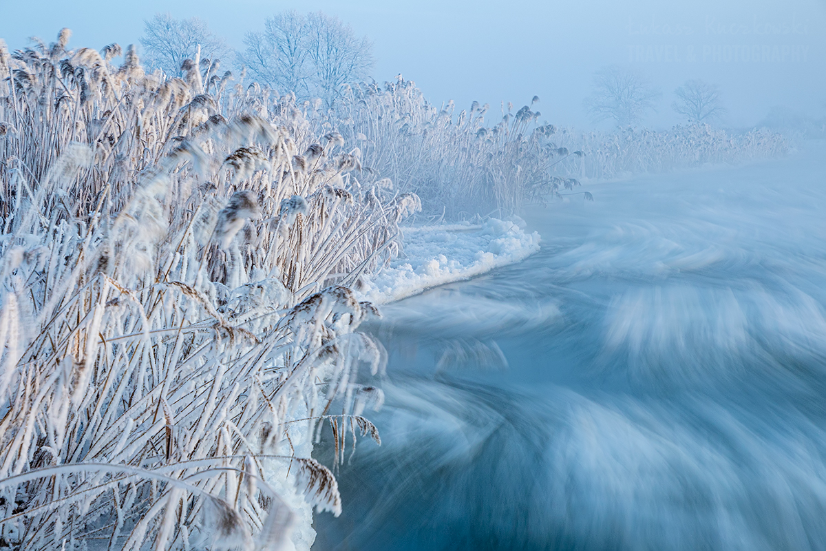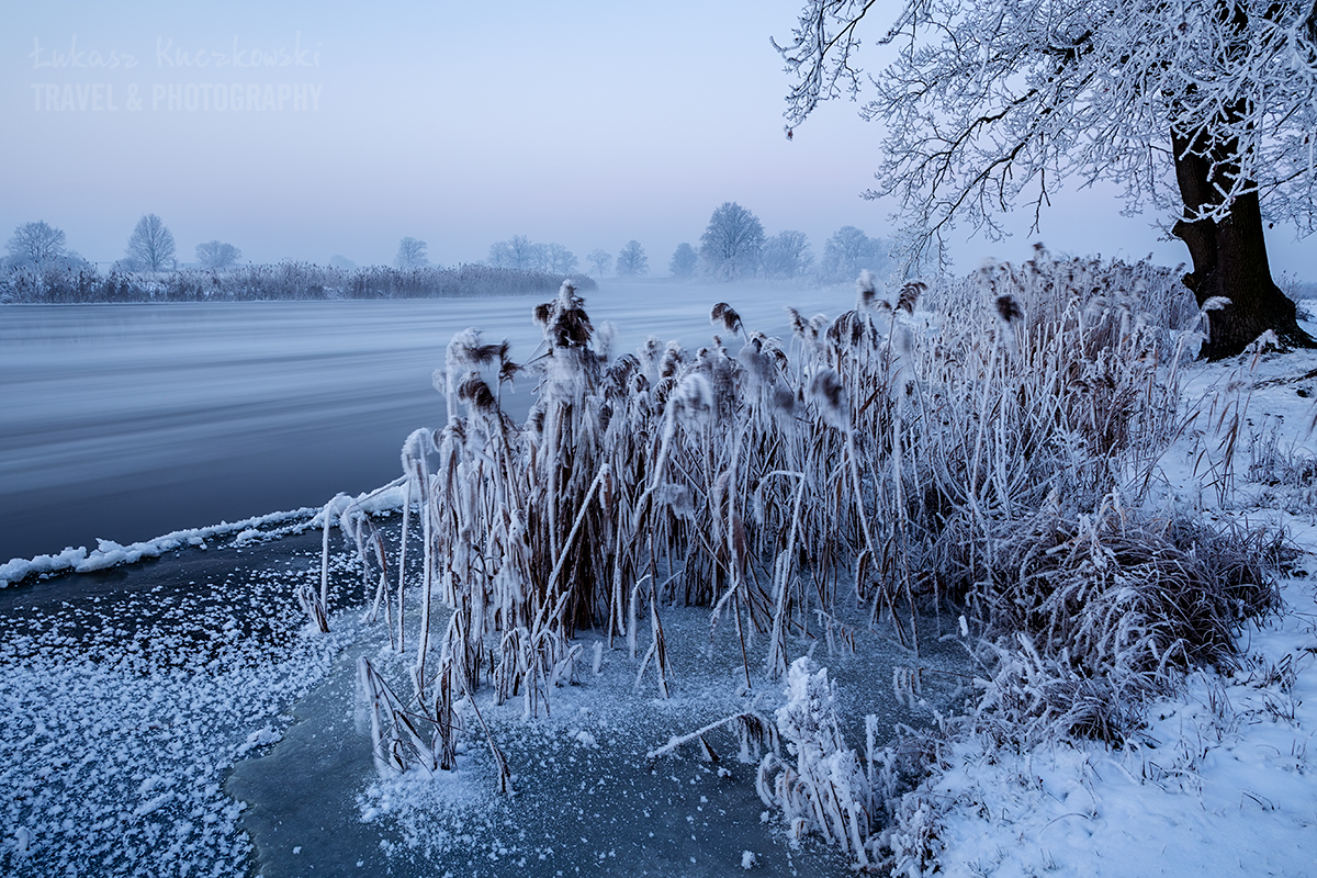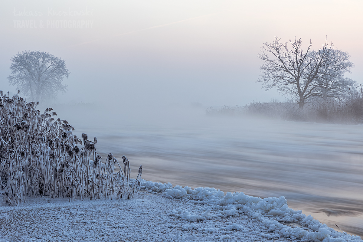 Wstałem o piątej rano. Herbata do termosu, polar, softhshell, puchówka i kurtka przeciwwiatrowa na siebie, dwie pary rękawic, ciepła czapka i byłem gotowy wyruszyć na zdjęcia. Po godzinie w samochodzie byłem na miejscu. Chwilę później dotarł Karol. Temperatura wynosiła minus 19,5 stopnia. Brr, zimno, ale nie najgorzej. Pierwsze zdjęcie wyzwoliłem o 6.48 – było jeszcze ciemno, ale wtedy najlepiej wychodzą niebieskości. Wartą płynęło dużo śryżu (czyli takiej lekkiej kry lodowej). Drzewa i trzciny były gęsto oblepione szadzią. Różne miejscówki zapewniały różną prędkość wody, co momentalnie przekładało się na rozmycie rzeki. Woda intensywnie parowała. Dalsze dęby otulała mgła. Wszechobecną ciszę płynącej wody zakłócał jedynie szum ciężarówek z nieodległej autostrady. Po nocy głos się niesie niesłychanie.