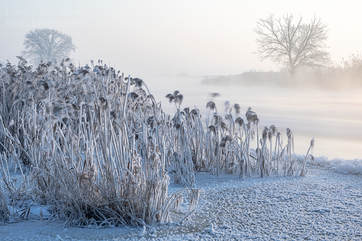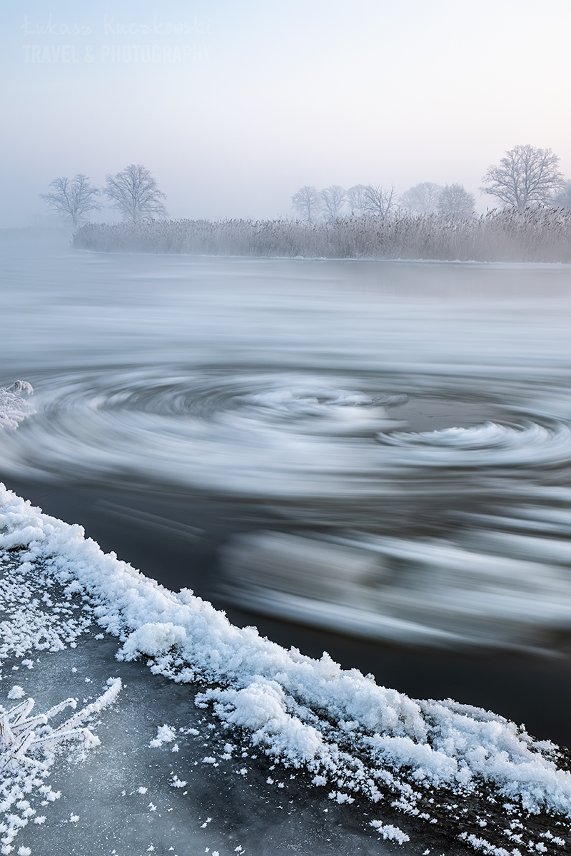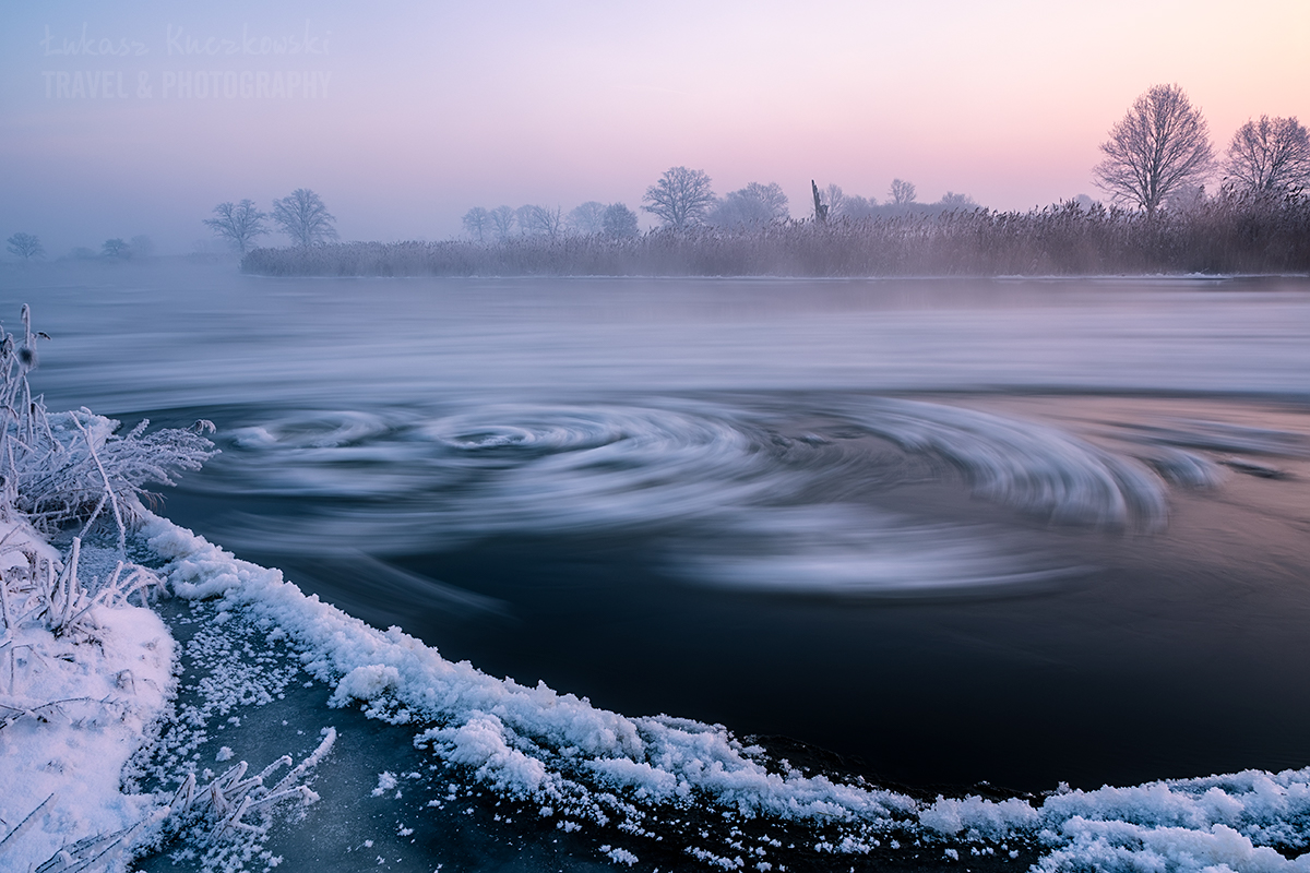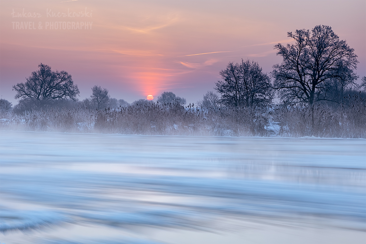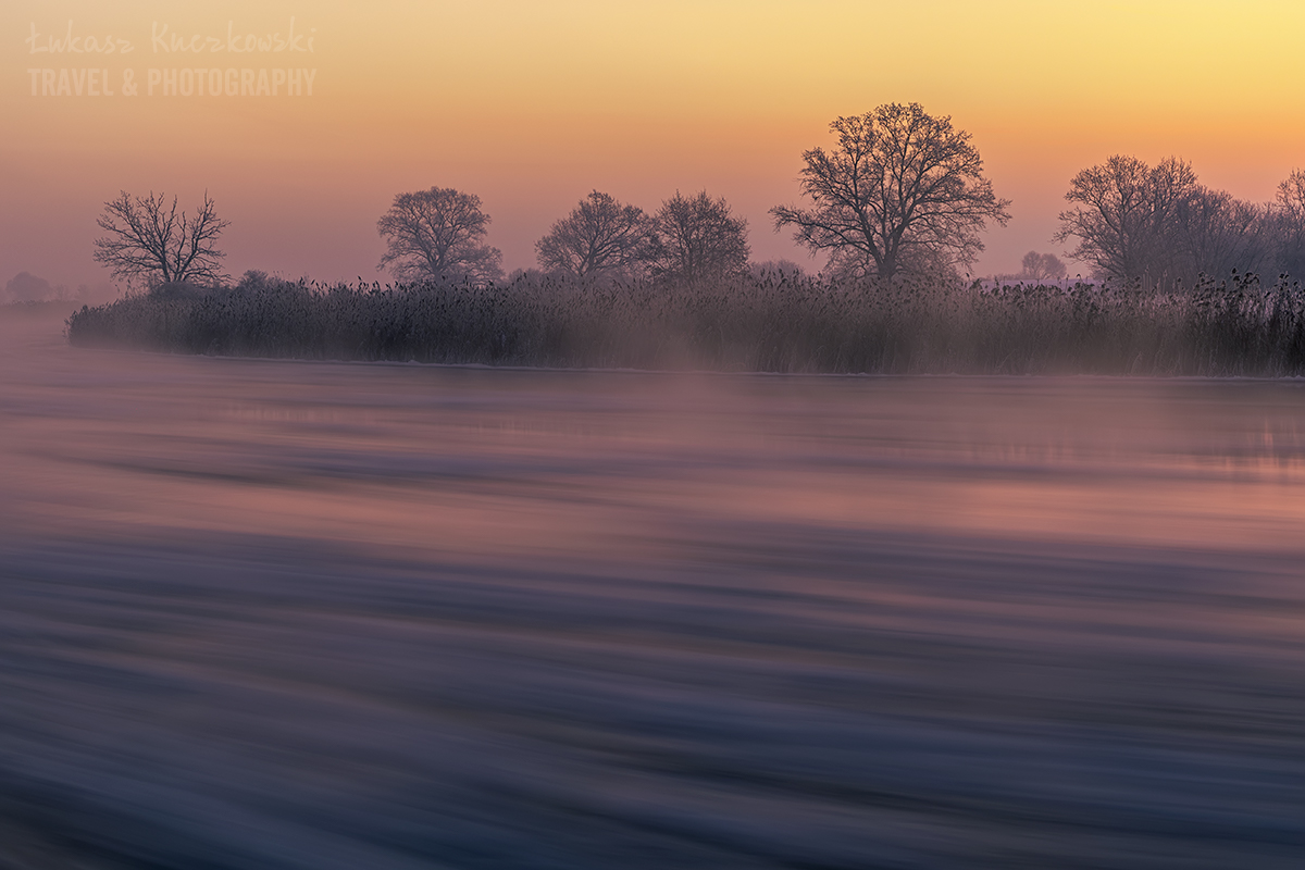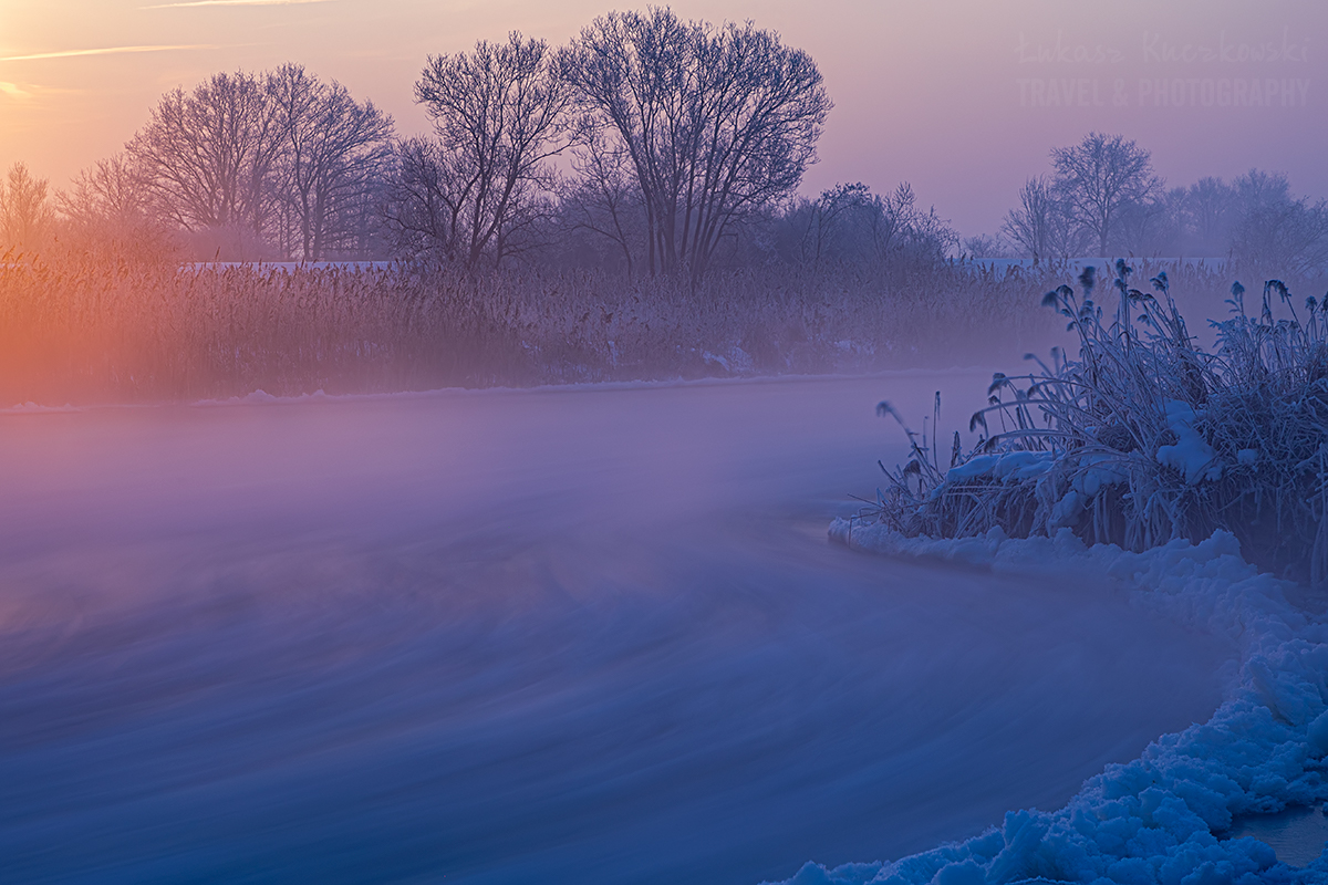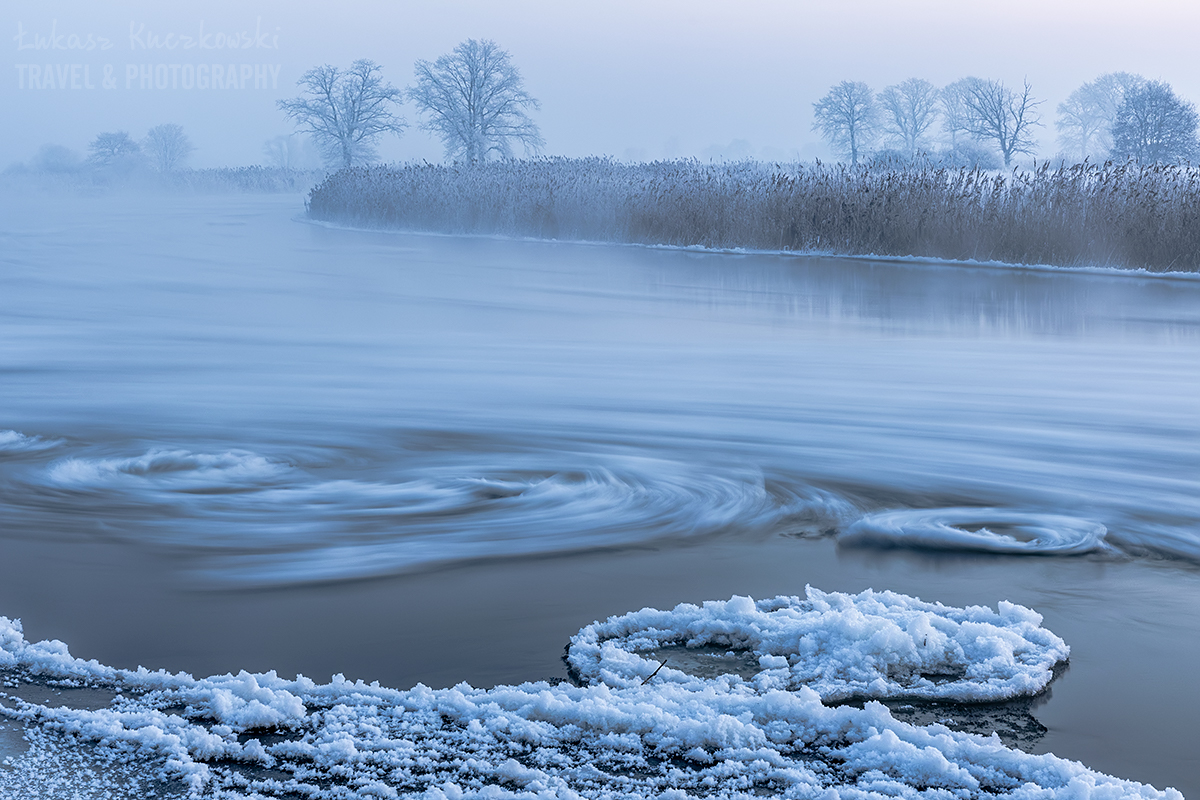 Wstałem o piątej rano. Herbata do termosu, polar, softhshell, puchówka i kurtka przeciwwiatrowa na siebie, dwie pary rękawic, ciepła czapka i byłem gotowy wyruszyć na zdjęcia. Po godzinie w samochodzie byłem na miejscu. Chwilę później dotarł Karol. Temperatura wynosiła minus 19,5 stopnia. Brr, zimno, ale nie najgorzej. Pierwsze zdjęcie wyzwoliłem o 6.48 – było jeszcze ciemno, ale wtedy najlepiej wychodzą niebieskości. Wartą płynęło dużo śryżu (czyli takiej lekkiej kry lodowej). Drzewa i trzciny były gęsto oblepione szadzią. Różne miejscówki zapewniały różną prędkość wody, co momentalnie przekładało się na rozmycie rzeki. Woda intensywnie parowała. Dalsze dęby otulała mgła. Wszechobecną ciszę płynącej wody zakłócał jedynie szum ciężarówek z nieodległej autostrady. Po nocy głos się niesie niesłychanie.