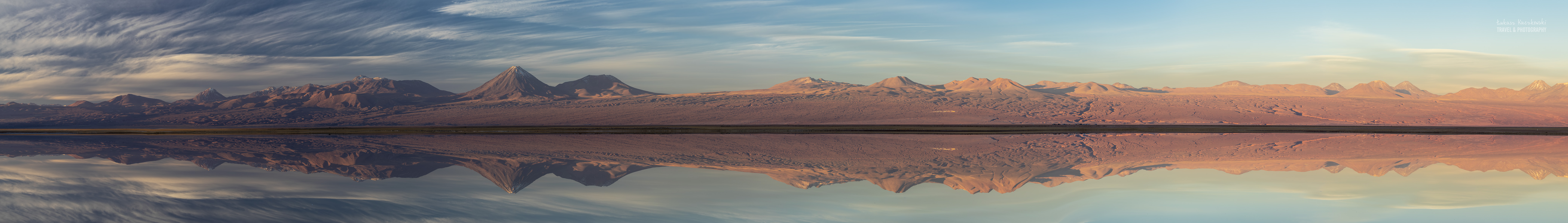 Panorama została złożona z 34 pionowych zdjęć wykonanych o zachodzie Słońca nad laguną Tebinquiche, Chile, Atacama.