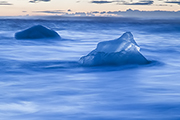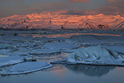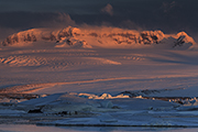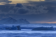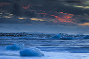 W oddali, na horyzoncie widać góry Vesturhorn. Pięknie się komponują z małymi górami lodowymi, które pływają na pierwszym planie. Do tego dochodzi niebo, które zaczyna jednak mienić się czerwienią. Pojawiają się lekkie chmurki. Jest ciekawie. Trzeba tylko popuścić wodze wyobraźni. Nie trwa to oczywiście wiecznie, ale mam wystarczająco dużo czasu, aby zrobić kilka zdjęć. Takich, które mi się podobają.
