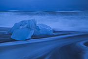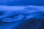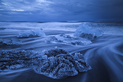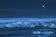 Księżyc pięknie nam przyświecał gdy wysiadaliśmy na plaży z samochodu. Plaża po lewej nadal była zajęta przez ekipę filmową. Znowu zatem udaliśmy się na plażę prawą. Wszędzie leżały porozrzucane kawałki lodu. Fale nie były duże, ale i tak cały brzeg bulgotał.