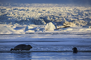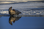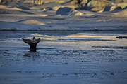 Nagle przypływa do nas zaciekawiona foka. Po chwili druga. Pluskają przed nami. Jakby odgadły, że jesteśmy fotografami. Jak na zawołanie pierwsza z nich gramoli się na nieodległa taflę lodu. Po kilku minutach dołącza do niej druga. Na dodatek kręci się jeszcze trzecia. Towarzyszy im ptak, którego nazwałem w myślach perkozem. Bo miał taki dłuższy dziób.