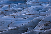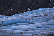 Wreszcie docieramy do czoła lodowca. Nie ma żadnej większej laguny – od lodu dzieli nas góra kilkanaście metrów. Czoło wznosi się wysoko – tak na oko ok. 40 metrów. Lód jest niebieski i biały – we wszystkich możliwych odcieniach. Na brzegu leży połamana kra. Nie ma jakiś większych gór lodowych – zapewne ten lodowiec raczej spokojnie topnieje.