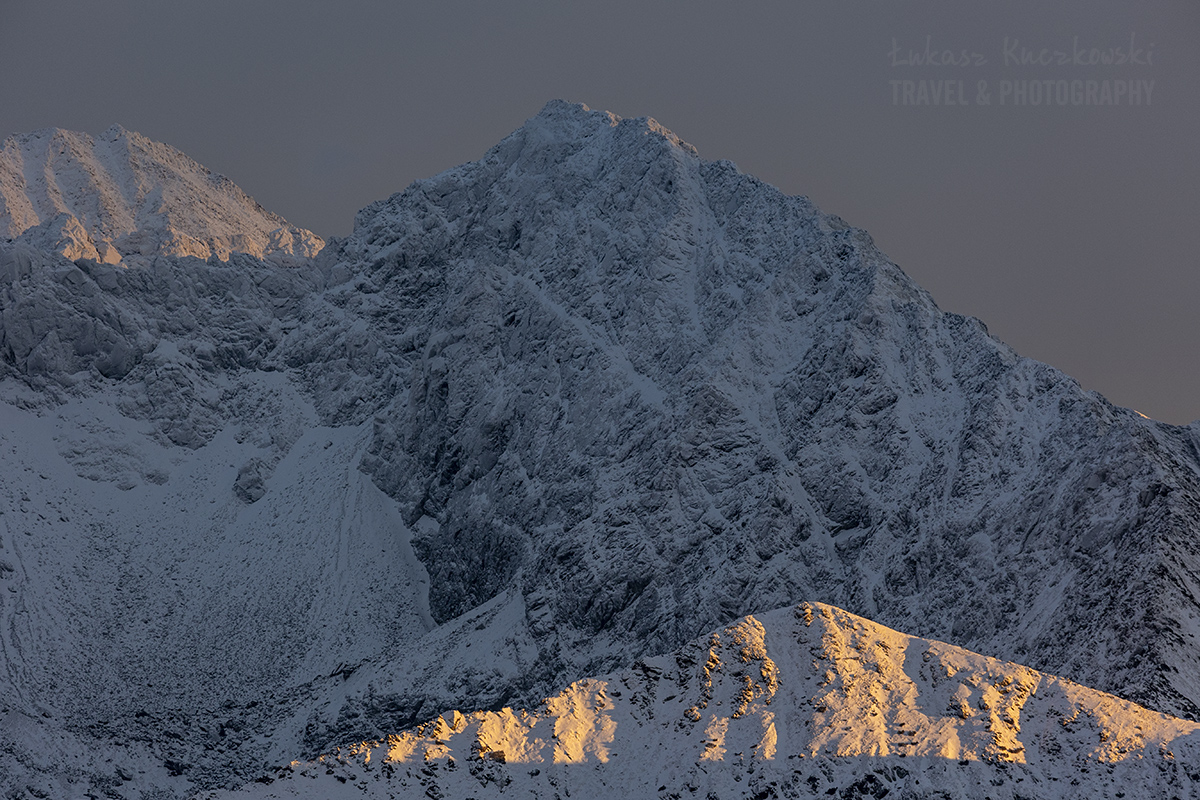 W wzmagającym się wietrze dotarliśmy na przełęcz pod Kopą. Powoli słońce chyliło się ku zachodowi i trzeba było wejść na Kopę dla lepszych widoków. Ostatnie podejście pamiętam jako mozolną walkę z samym sobie. W oznaki dał się krótki sen, 7h za kierownicą i 2h trawers Wierchów. Nie widziałem końca podejścia, a to przecież tylko 20 minut z przełęczy. W końcu docieram na górę. Wieje. Jest o wiele zimniej, zakładam zatem puchówkę, kominiarkę, grube rękawice i dodatkowe spodnie. Od razu cieplej. Można zacząć planować zdjęcia.